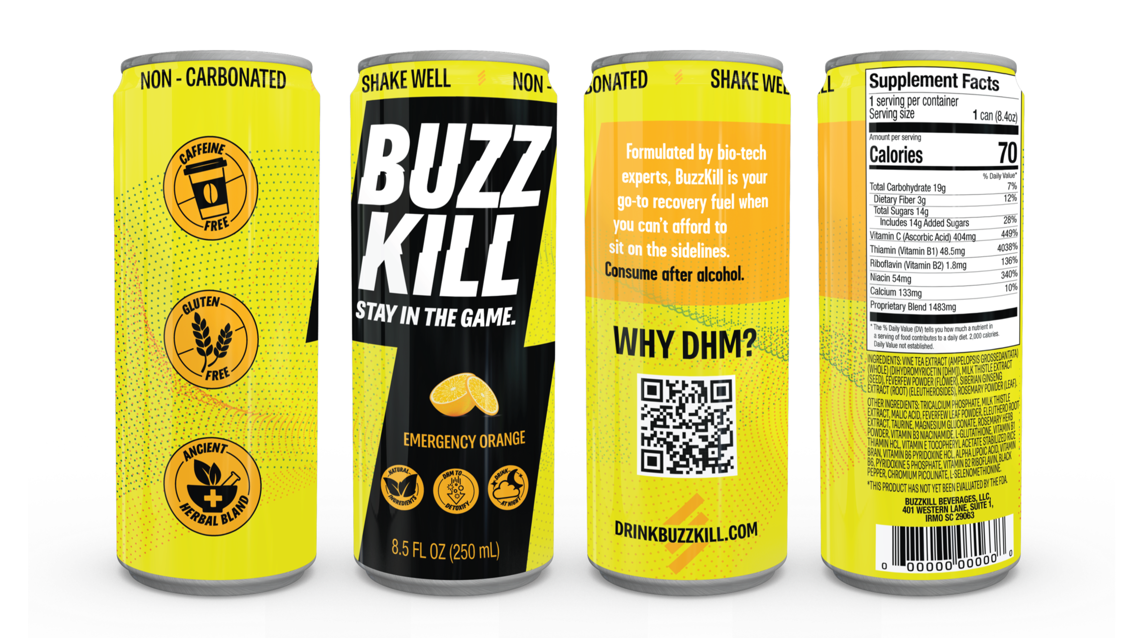 When thinking about how to create Buzzkill’s visual identity, I decided to create a dotted-line pattern that refers to the science that makes the product work. The pattern in the design continuously wraps around the can and is distinct from patterns that evoke motion or energy to set it apart from energy drinks on the market.